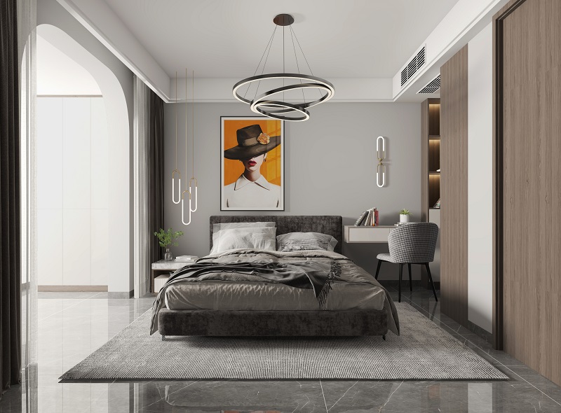 卧室以灰色为主,深灰的布艺大床上方布置了极具艺术感的吊灯,再搭配上左侧现代时尚、金属质感的床头灯,轻奢感十足。橙色的壁画减少沉闷感,使整个空间更加惬意。